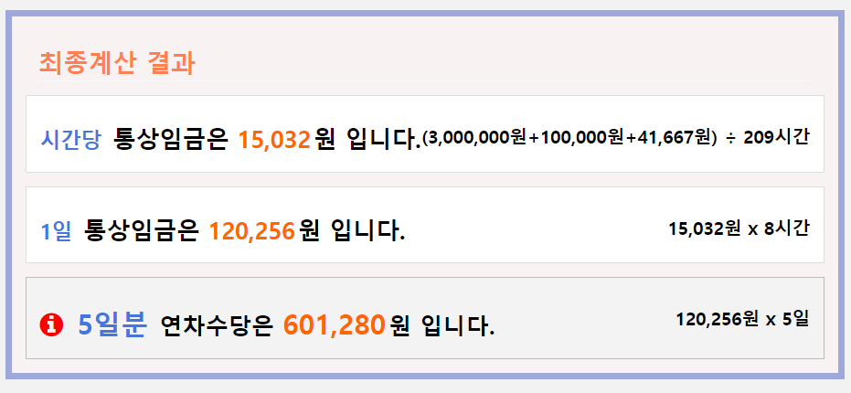 따라서 하루 통상임금과 남은 연차 개수인 5를 곱했을 때 601,280원이 연차수당이라고 할 수 있겠습니다.