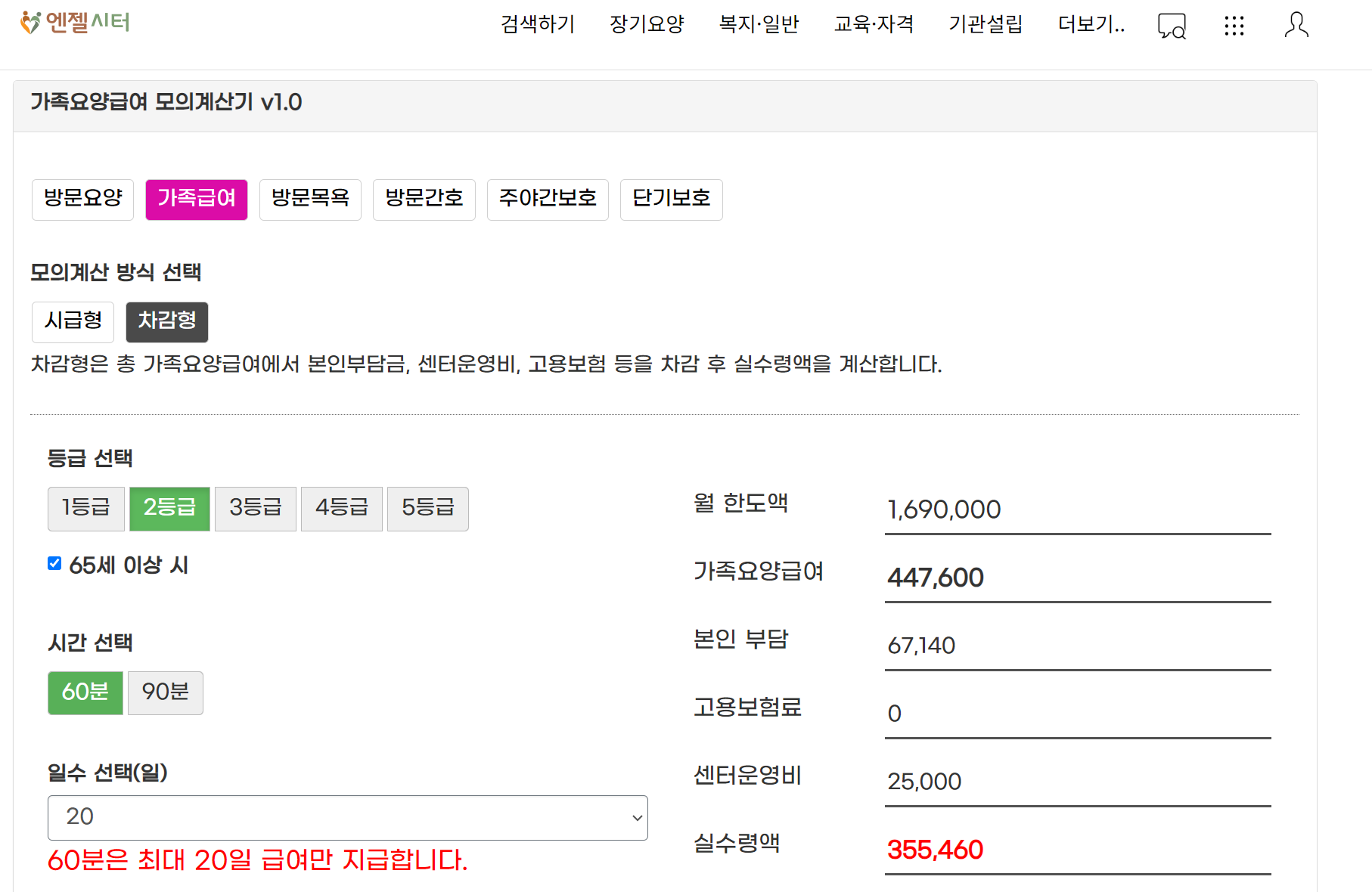 한 달에 20일을 근무하는 형태로 60분동안 가족을 케어할 경우에는 한 시간 기준 23,480원으로 계산하여 최대 469,600원 가량을 받을 수 있습니다.