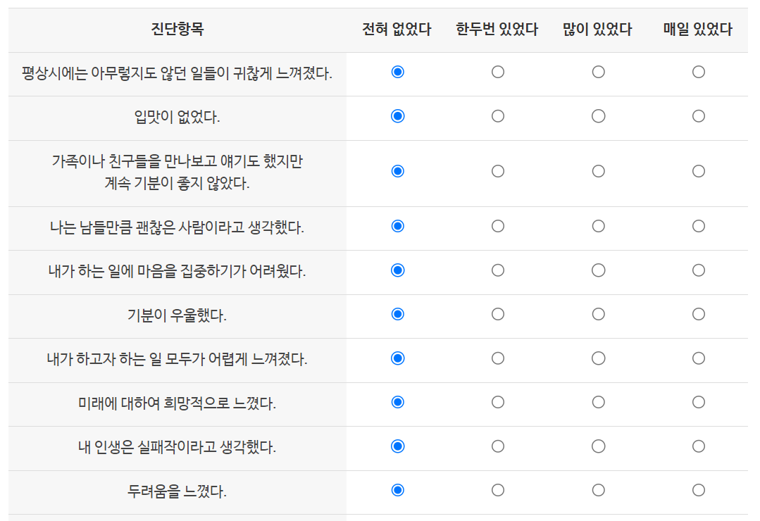 아래 항목 등을 확인해보시고 일주일동안 느꼈던 감정등의 빈도수에 따라 체크하여 진단해볼 수 있습니다.