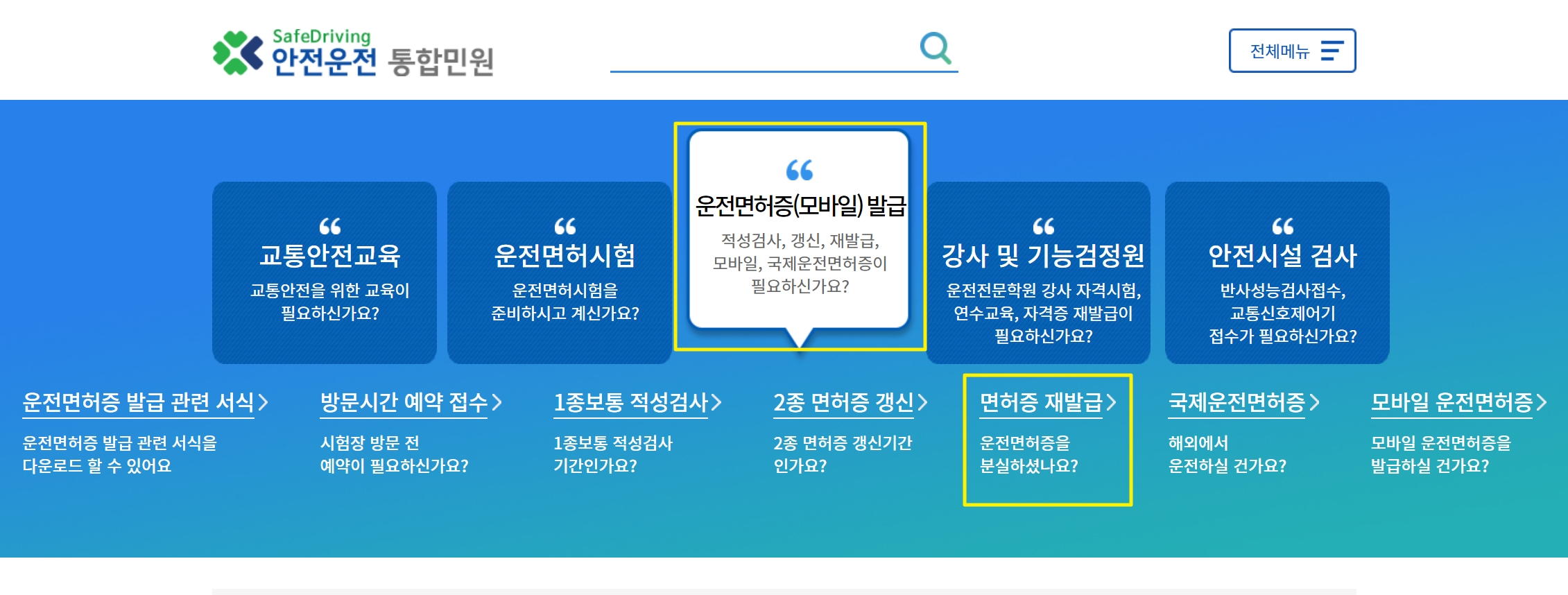 운전면허증 분실신고를 하셨다면 바로 재발급을 신청하는것이 좋습니다. 운전면허증 재발급은 도로교통부에서 운영하는 안전운전 통합민원 홈페이지에서 할 수 있습니다.