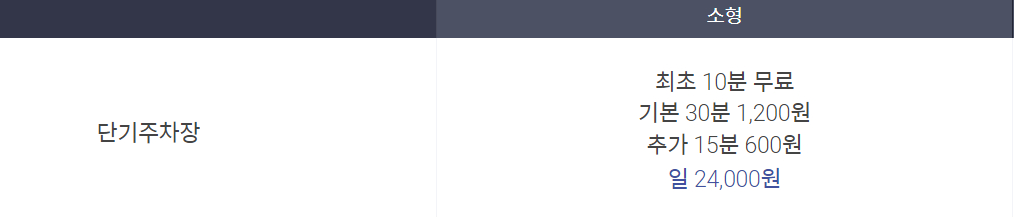 단기 주차장은 기본 30분에 1,200원씩 요금이 올라가며 하루 24시간동안 차량을 세워놓을 경우 24,000원의 요금이 부과됩니다.