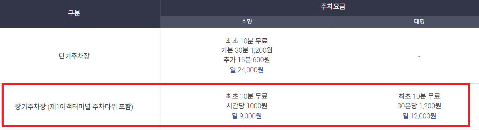 장기주차장 주차 요금은 단기주차장보다 일 주차요금이 훅 줄어듭니다. 아래 표를 참고해서 장기주차장 주차요금을 확인해보시고, 주차요금 계산기도 이용해보시기 바랍니다.