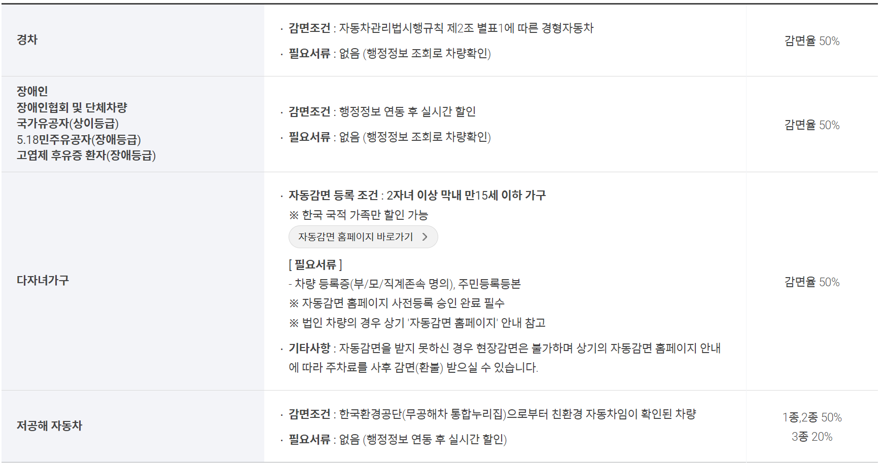 한국국적의 가족의 경우 아래 자동감면 홈페이지를 통해 등록 후 할인받아보시기 바랍니다.