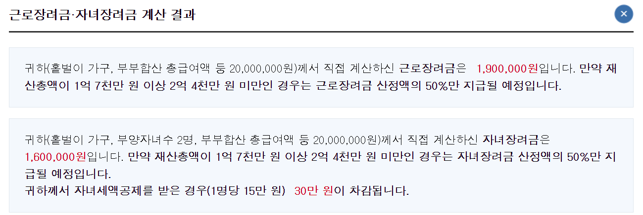 아래와 같이 계산 결과를 확인해 볼 경우 근로장려금과 자녀장려금이 어느 정도 나오는지 함께 확인할 수 있는데요, 자녀장려금의 경우 160만 원가량 받을 수 있는 것으로 확인됩니다.