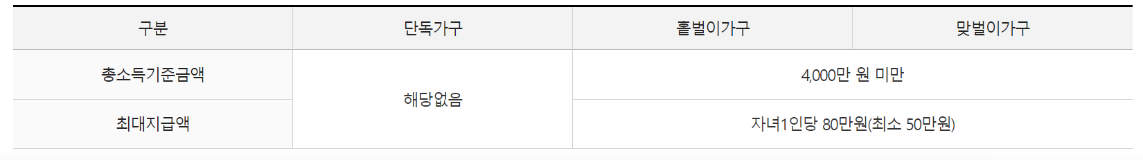 저소득 가구의 자녀 양육을 지원하기 위해총소득 부부합산 연 4,000만 원 미만이면서 부양가족이 있는 경우 최대 80만 원까지 지급하는 제도입니다.