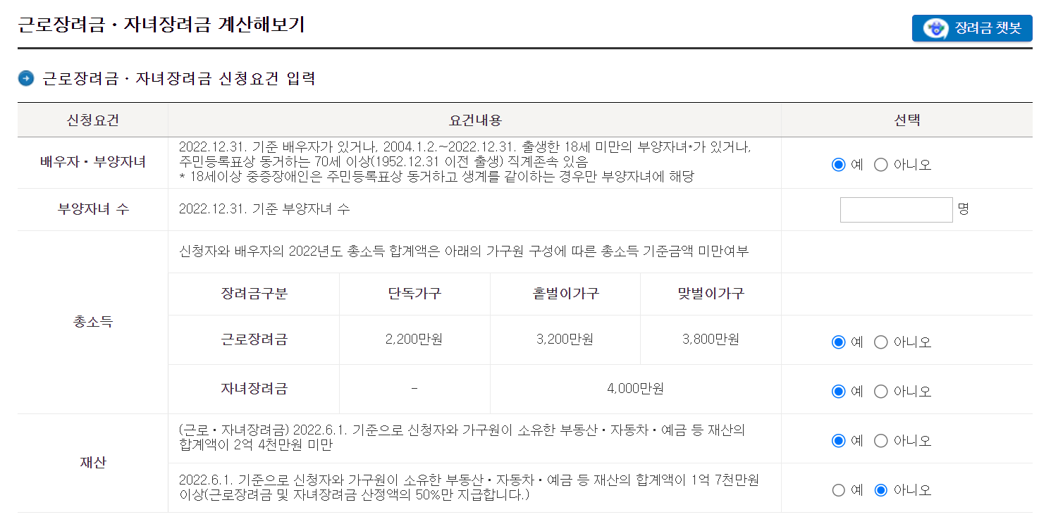 내 조건에 맞는 여러 가지 사항을 기입할 경우 자녀장려금을 받을 수 있는지 확인이 가능한데요, 아래 모의계산 페이지에서 재산 및 소득에 대한 부분을 모의로 기입해 보도록 하겠습니다.