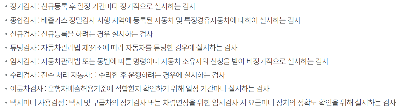 자동차검사는 매번 일정 기간마다 정기적으로 실시하는 정기검사가 있고, 배출가스라던지 특성 경유 자동차에 대해 실시하는 검사라던지, 튜닝한 경우에도 실시하는 검사 등 여러가지가 있습니다.