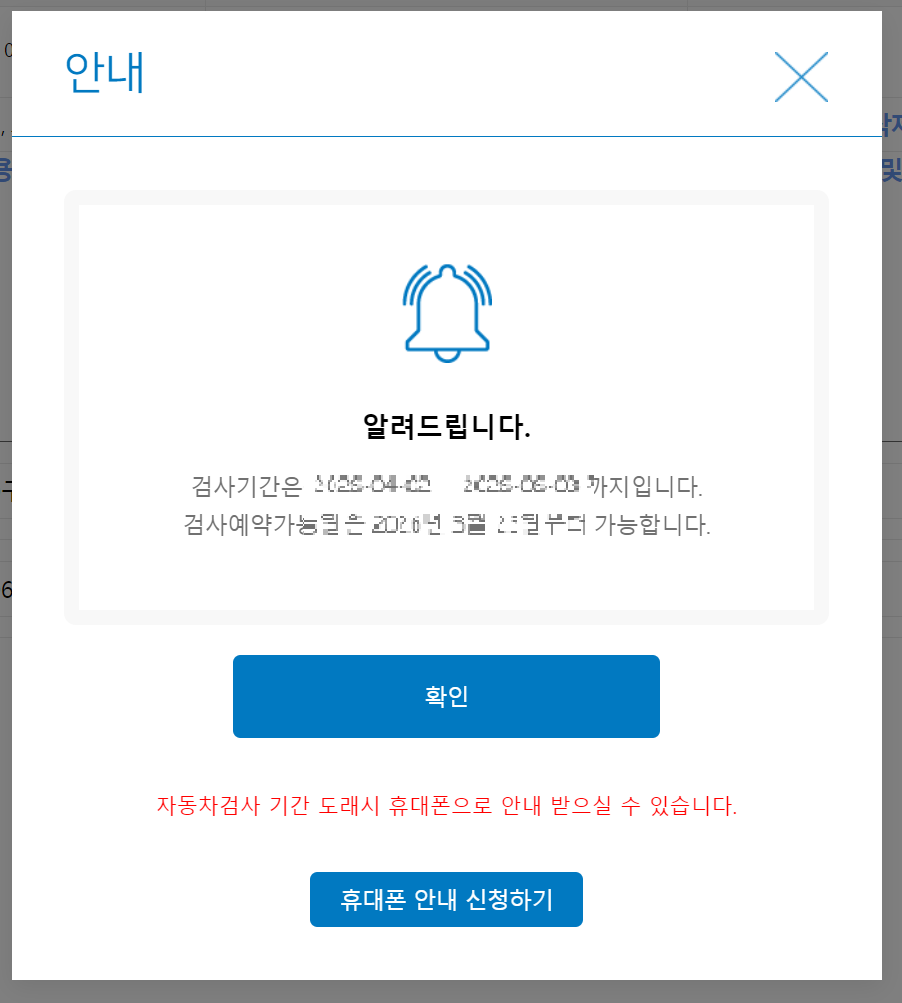 만약 자동차검사기간이라면 예약할 수 있는 사이트로 넘어가지만, 저와같이 검사기간 날짜가 많이 남았을 경우에는 아래와 같은 창이 뜨게됩니다.