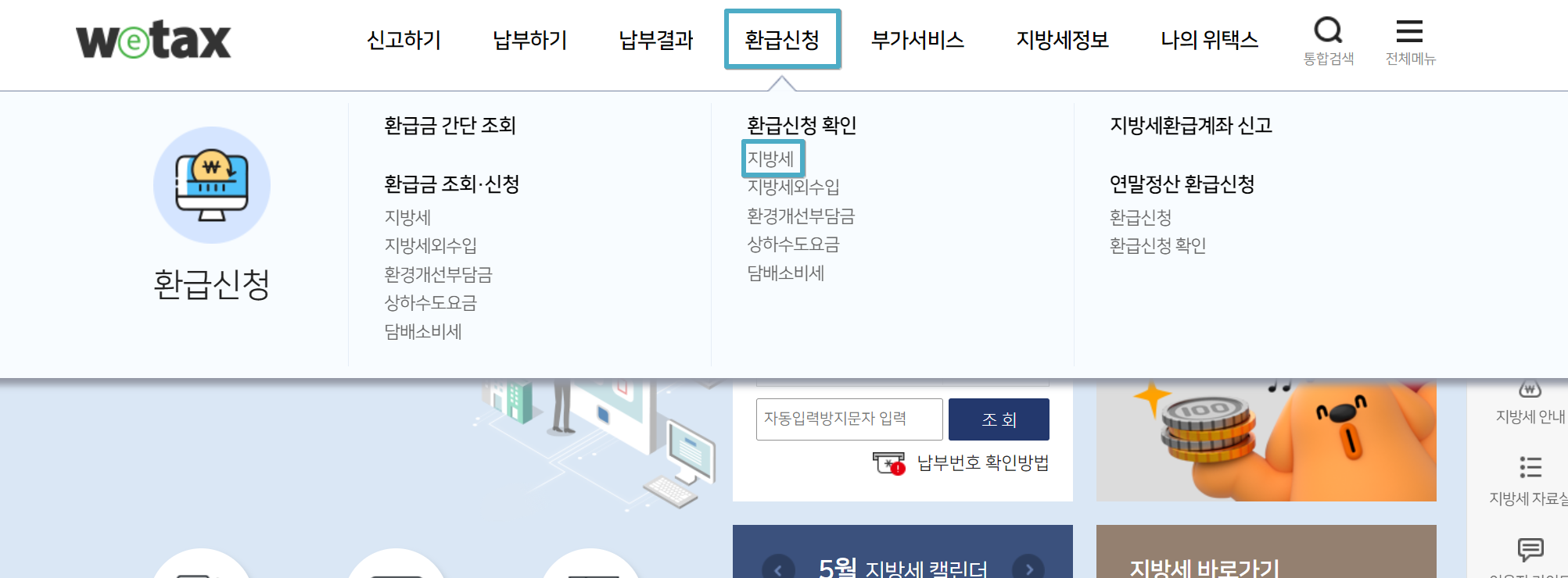 위 버튼을 클릭 후 위택스 홈페이지에서 로그인 후 환급신청 > 지방세 > 환급 대상액 > 다음 > 환급신청 > 환급받을 계좌정보 입력 > 신청 버튼을 차례대로 눌러주시면 됩니다.