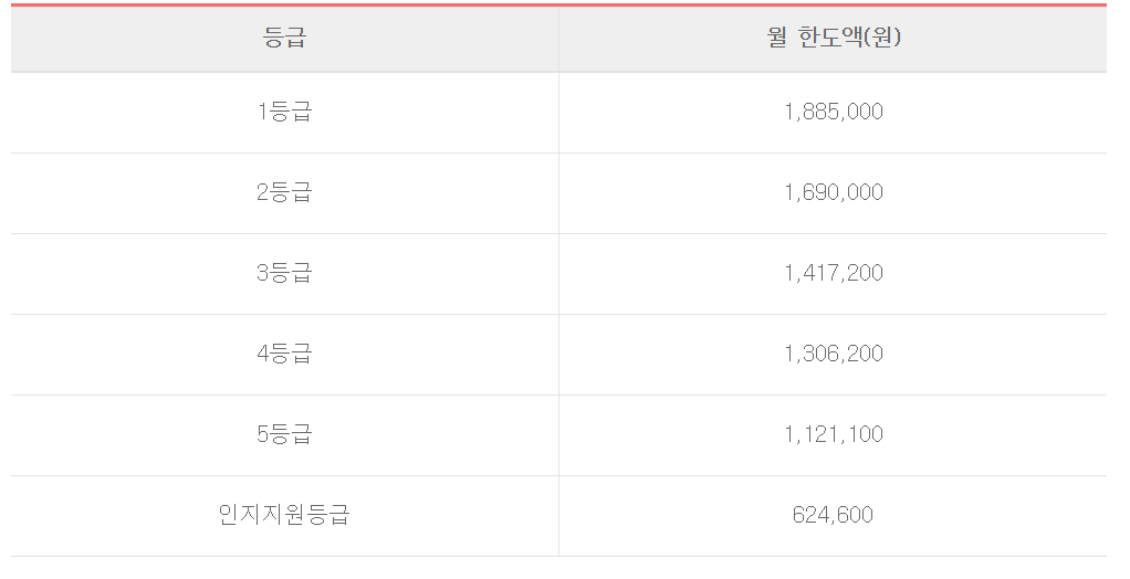 1등급은 재가급여 한도가 1,885,000원으로 가장 많이 받게됩니다. 요양시설 자체가 이 장기요양등급 중 1~3등급까지만 받고있기 때문에 1등급이 될 경우 재가센터에 입소할 수 있게 됩니다.