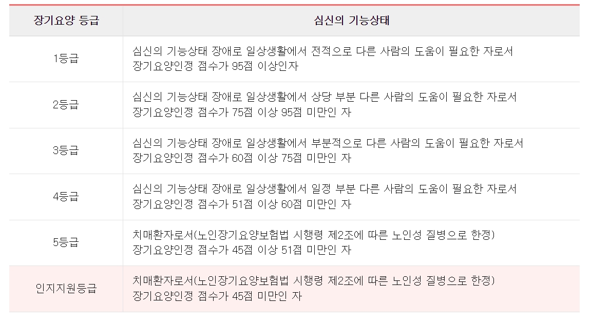 이러한 질병들은 일상생활이 어렵기 때문에 집에서 어른을 돌보는 사람이 있어야 하는데요 일상 생활 자립이 가능 유무에 따라 어르신의 행동이나 질환 들을 건강 등급을 나누고 그에 따른 요양 서비스를 정부가 지원합니다.