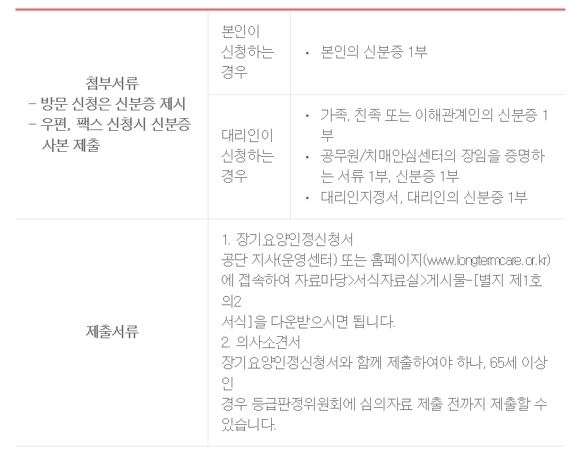 장기요양 등급 신청을 할 때 필요한 서류들이 있습니다. 다만 위와같은 질병의 경우 본인이 처리하기 어려울 수 있기 때문에 대리인이 신청할 경우 필요한 첨부서류 함께 알려드리도록 하겠습니다.