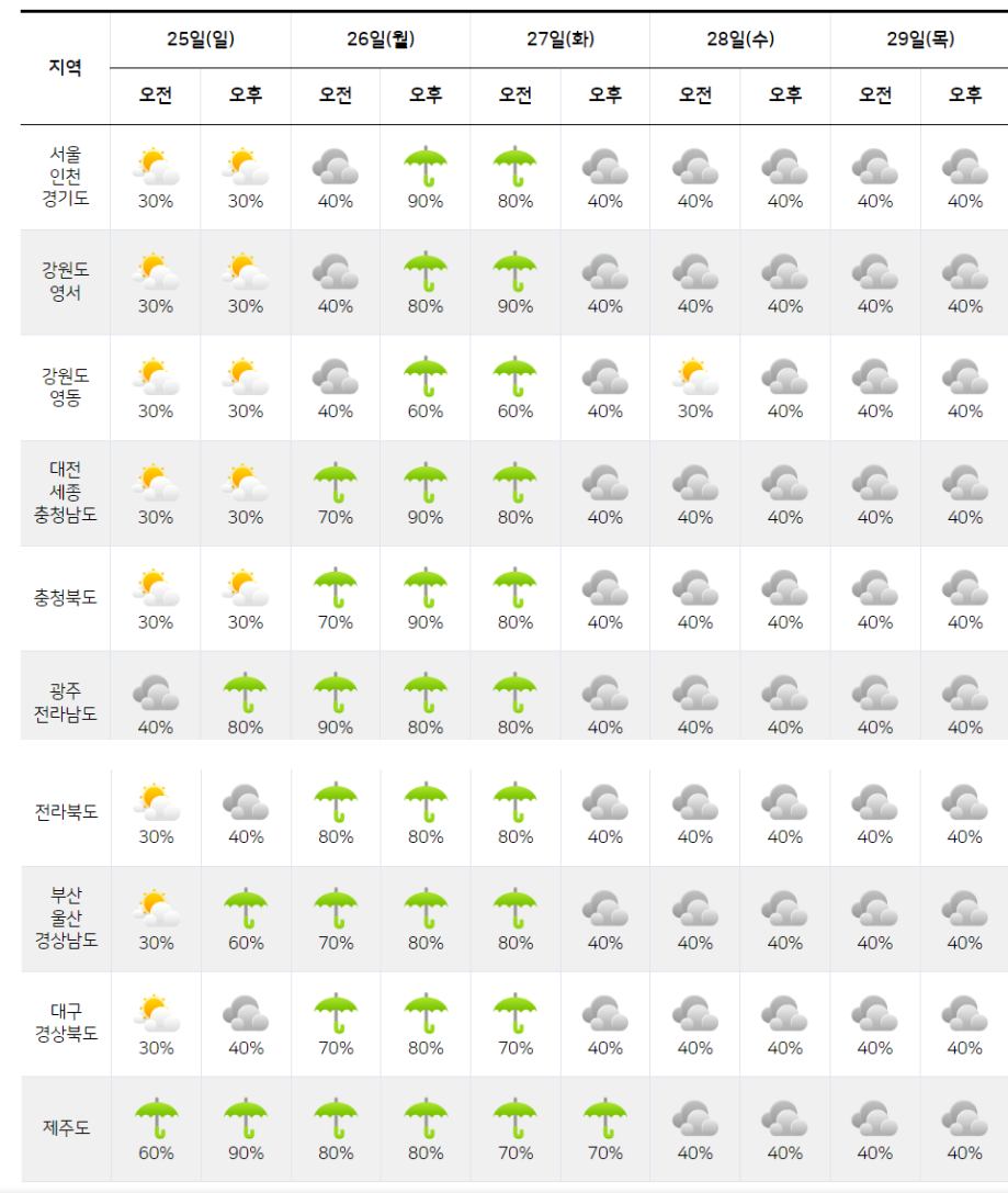 기상청에 따르면 오늘부터 제주도를 시작으로 호우주의보가 시작됩니다. 따라서 내일부터 글피까지 많은 비가 예상됩니다.
