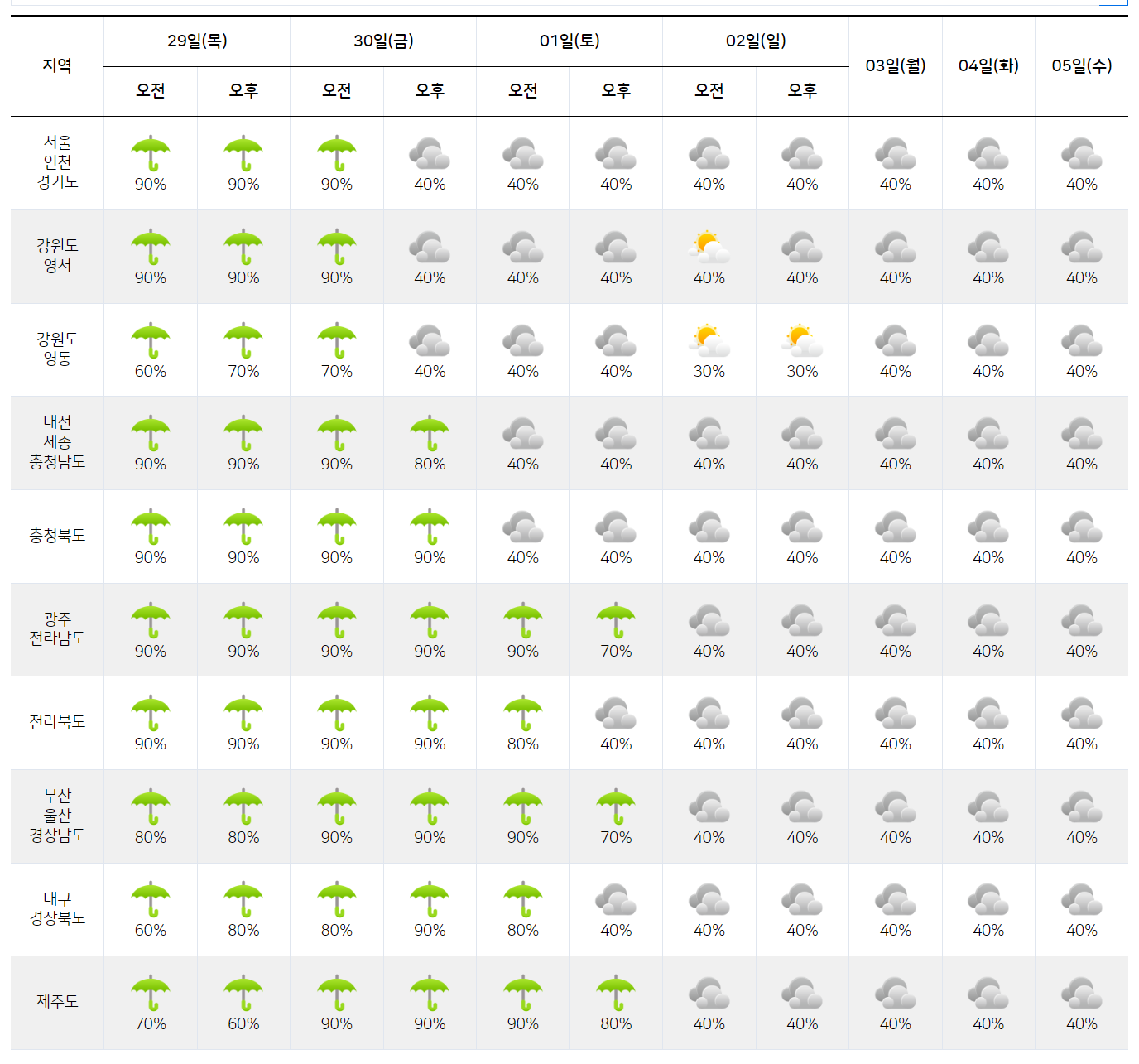 29일은 지역에 따라 비가 오는 지역도 있고 오지 않는 지역도 있는데요 항상 우산을 준비해서 다니셔야겠습니다. 7월 한 달 동안은 주기적으로 날씨를 확인하셔야 비를 피할 수 있을 것으로 생각됩니다.