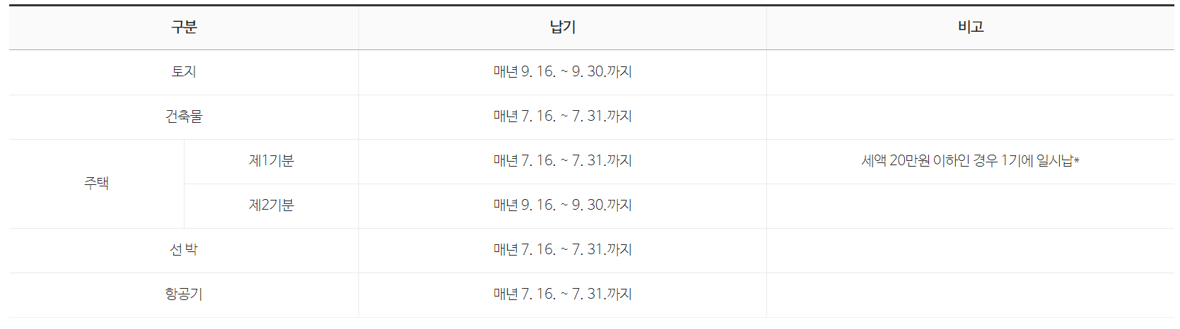아래 표를 참고하시어 재산세 납기일을 체크해 보시기 바랍니다.