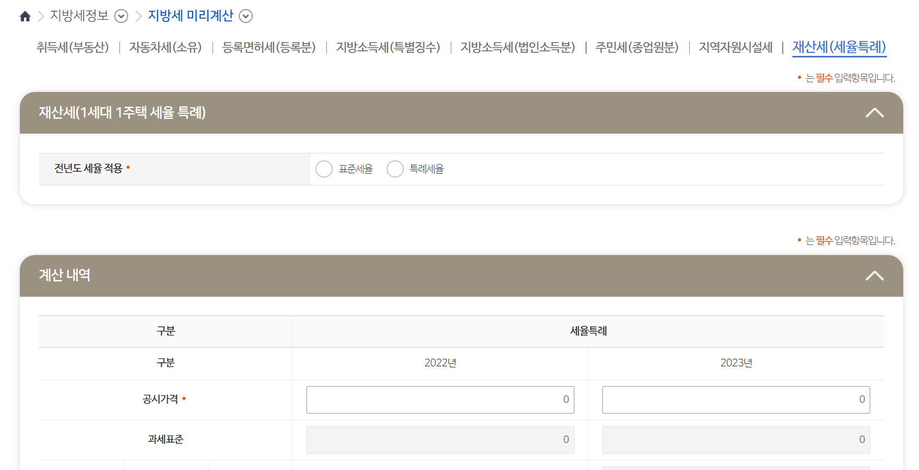 재산세 버튼을 클릭하실 경우 아래와 같은 페이지가 나오는데요, 만약 주택의 경우 표준세율을 선택하시면 되며 선박, 항공기 등의 경우 특례세율을 선택해 계산하시면 됩니다.