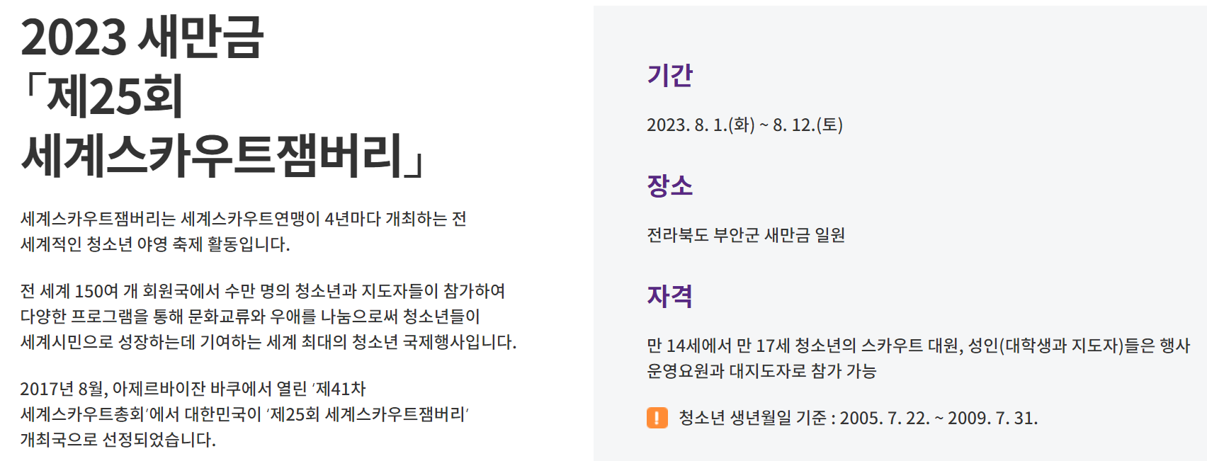 전 세계 150여개 회원국에서 5만명 가까이되는 청소년들과 지도자들이 참가하는 세계 최대의 청소년 국제행사입니다.