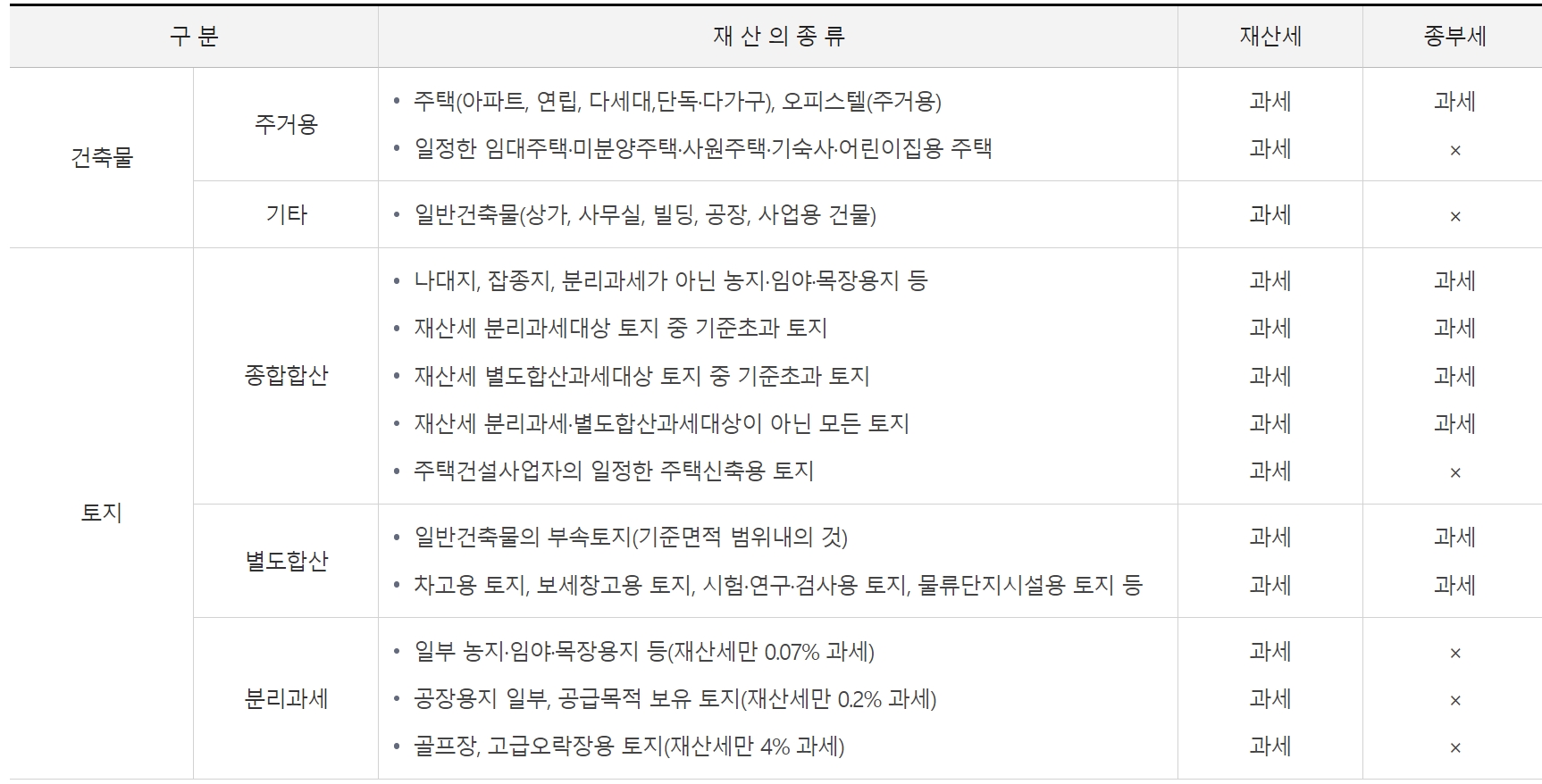 이처럼 재산의 종류에 따라 재산세는 모두 내야하지만 종부세는 과세되지 않을 수도 있습니다.