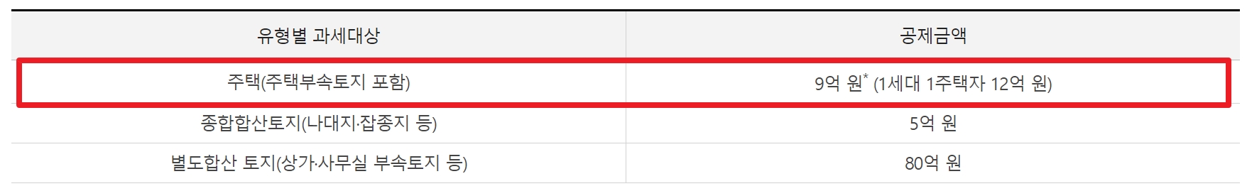 주택은 재산세 과세대상과 같고 아파트, 연립, 다세대, 단독주택, 다가구 주택, 주거용 오피스텔에 경우 과세대상이 됩니다. 그 공제금액은 아래 표를 참고하시어 확인해보시기 바랍니다.