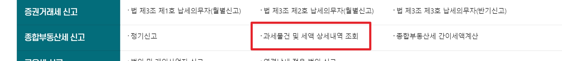 위 버튼을 클릭 후 국세청 홈택스 > 세금신고 > 종합부동산세 신고 > 과세물건 및 세액 상세내역 조회를 차례대 클릭하시면 됩니다.