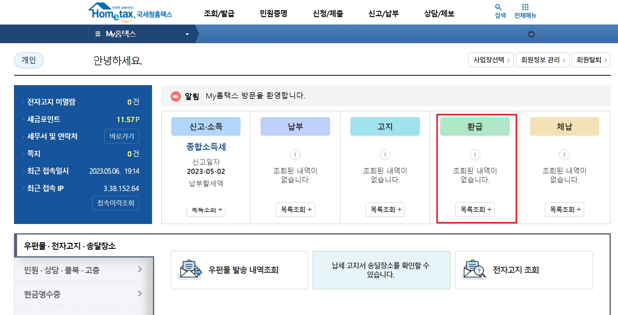종합소득세 환급금 조회