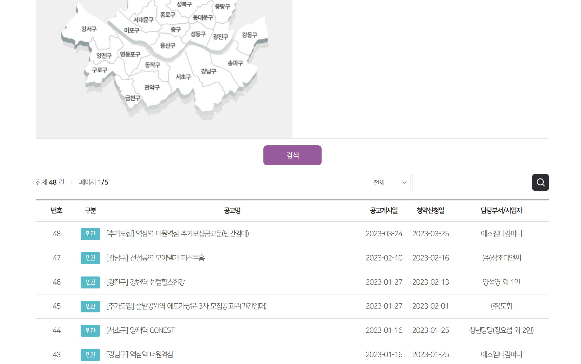 스마트 검색 또는 지도검색을 활용하여 청년주택 모집공고를 체크해 볼 수 있습니다. 현재는 서울특별시에서만 모집공고를 하고 있는데요,