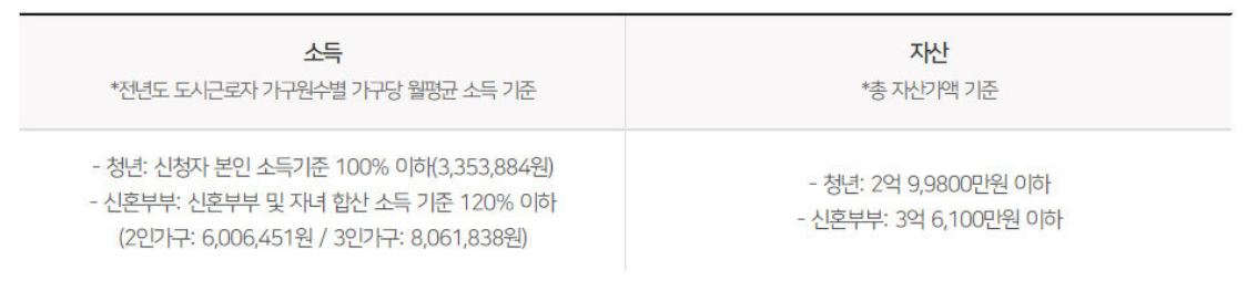 해당 청년 주택에 입주하기 위해서는 무주택자여야 하며 소득과 자산 기준을 아래 표에서 확인해 보셔야겠습니다. 청년은 자산이 3억이 넘으면 입주가 불가하오니 자녀까지 가구원 수를 포함하여 월평균 소득까지 체크하시기 바랍니다.