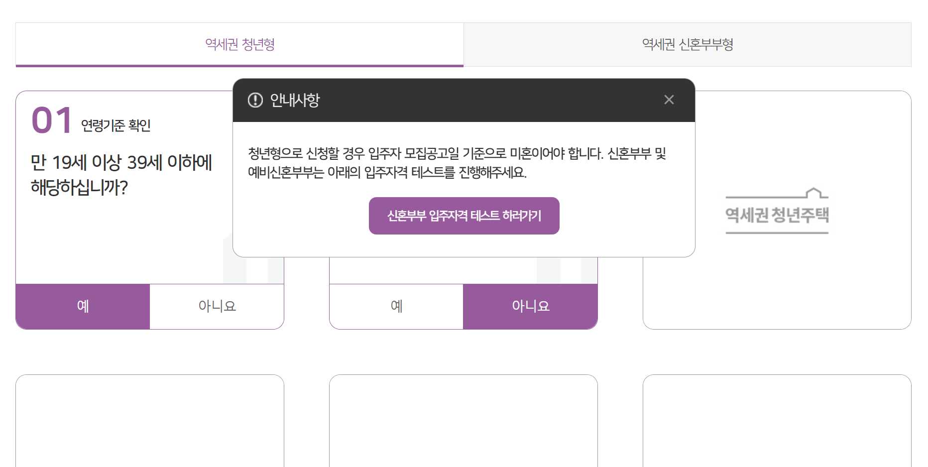 역세권청년형인데 결혼 유무로 체크하면 이와 같이 신혼부부 입주자격 테스트 창으로 이동됩니다. 내 조건에 맞게 잘 체크하여 확인해 보시기 바랍니다.