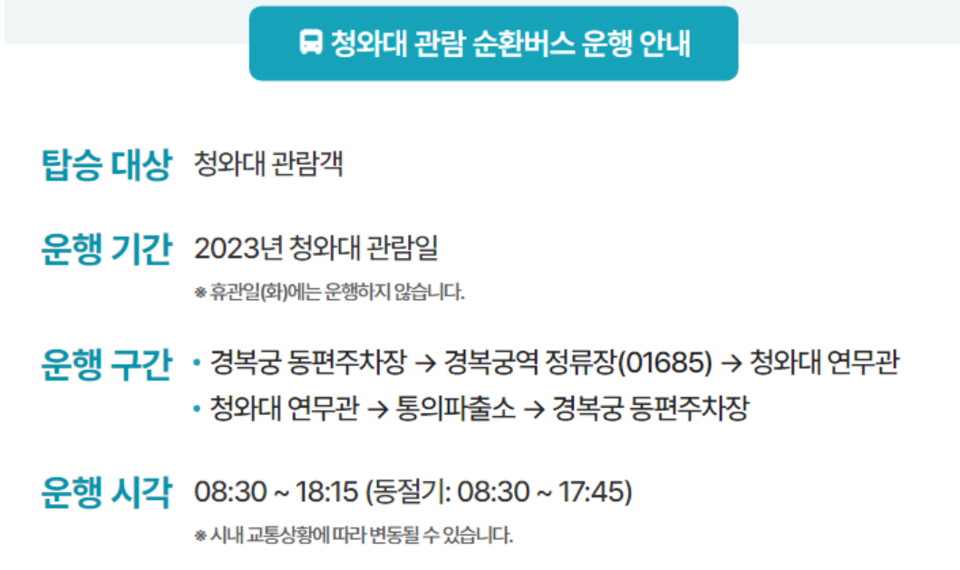 청와대 관람일 동안 청와대 관람객을 위한 순환버스가 운행됩니다. 자차가 아니신 분들은 대중교통을 이용하시고 순환버스를 활용해 보시기 바랍니다.