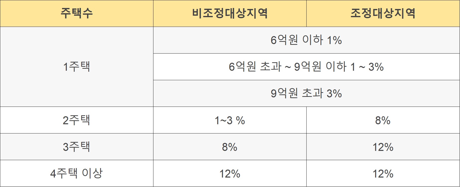 만약 조정대상지역에 있는 주택을 갖게 되거나 다주택자, 법인, 사치성 재산에 대해서는 중과세가 부과됩니다.