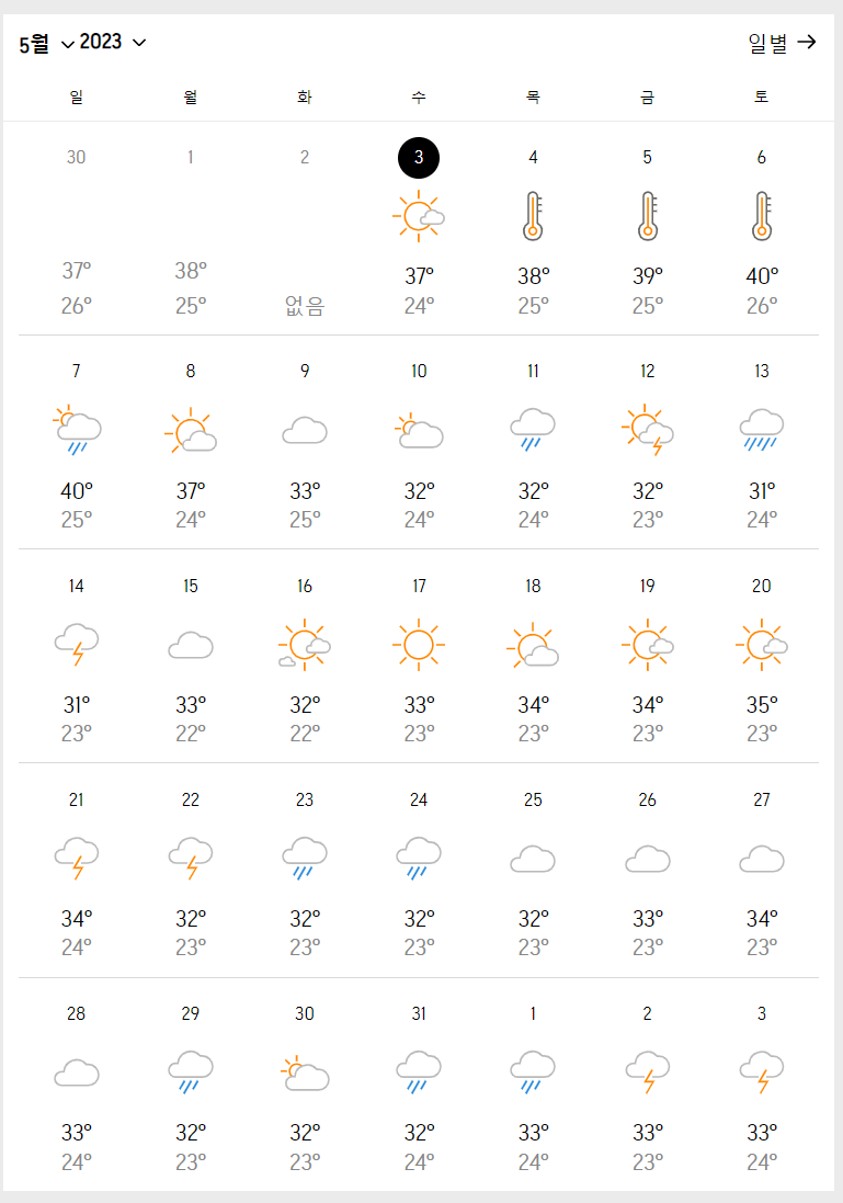 치앙마이 여행을 5월에 계획하시는 분들은 아래 이미지를 통해 날씨를 확인해보시기 바랍니다.
