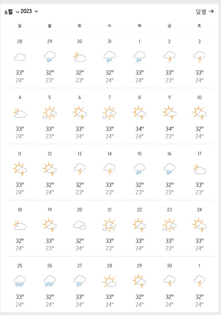 주차별로 날씨가 개었다가 비가 오는 양상을 볼 수 있습니다. 확실히 우기 기간에는 우산이나 우비를 챙기시는 것을 권장드립니다.