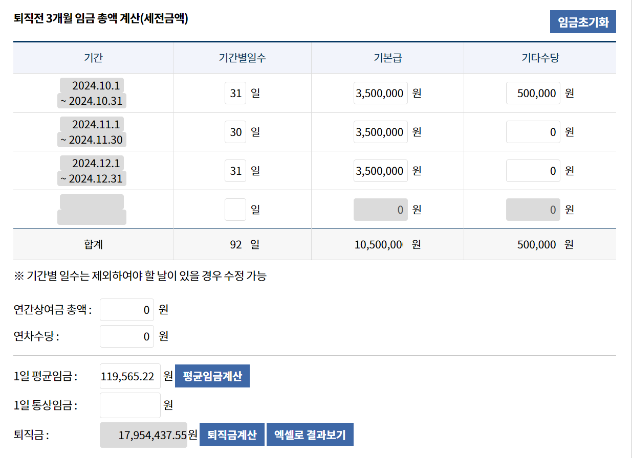 해당 계산기의 경우 고용노동부에서 제공하는 계산기로 믿을 수 있습니다. 해당 퇴직금의 금액은 모두 세전금액임을 참고하시기 바랍니다.