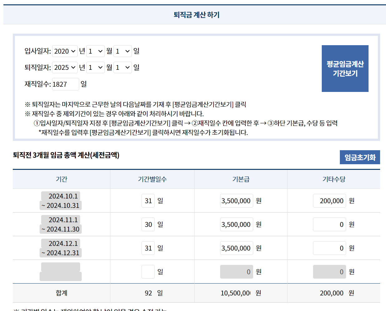 위 버튼을 클릭 후 고용노동부에서 제공하는 퇴직금 계산기로 바로 이동해봅니다. 입사일 퇴직일을 임의로 입력한 뒤 기본급과 기타수당등을 입력합니다.