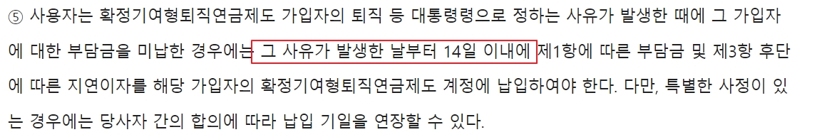 퇴직금은 근로자퇴직급여보장법 제 20조에 따라 퇴직한 날로부터 14일 이내에 퇴직금을 받아야 합니다. 만약 14일 이내 지급하지않았을 경우 지연 일수에 가산이자를 지급해야 합니다.