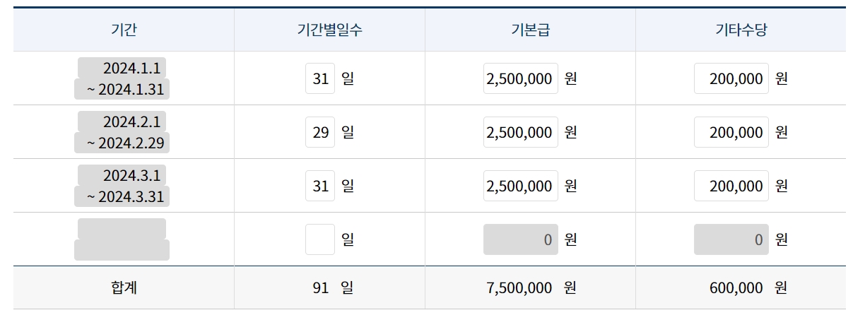 평균임금 계산 기간보기 버튼 클릭하면 아래와 같이 마지막 3개월치의 기본급과 기타수당 등을 확인할 수 있습니다.