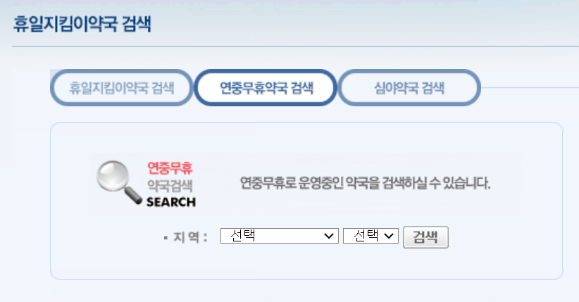 야간시간인 저녁 6시부터 익일 8시까지 메인 페이지에서 휴일지킴이 약국을 검색할 수 있습니다.