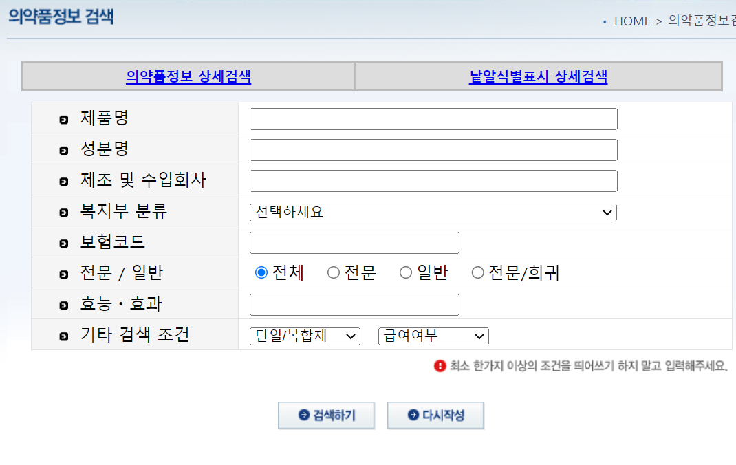 내가 갖고 있는 의약품이 먹어도 될까? 의심될 경우에는 해당 서비스를 통해 의약품을 검색해 보시기 바랍니다. 제품명이라던지 제조회사 등을 간편하게 기입한 뒤에 검색하기 버튼을 클릭할 경우 의약품 정보를 확인할 수 있습니다.