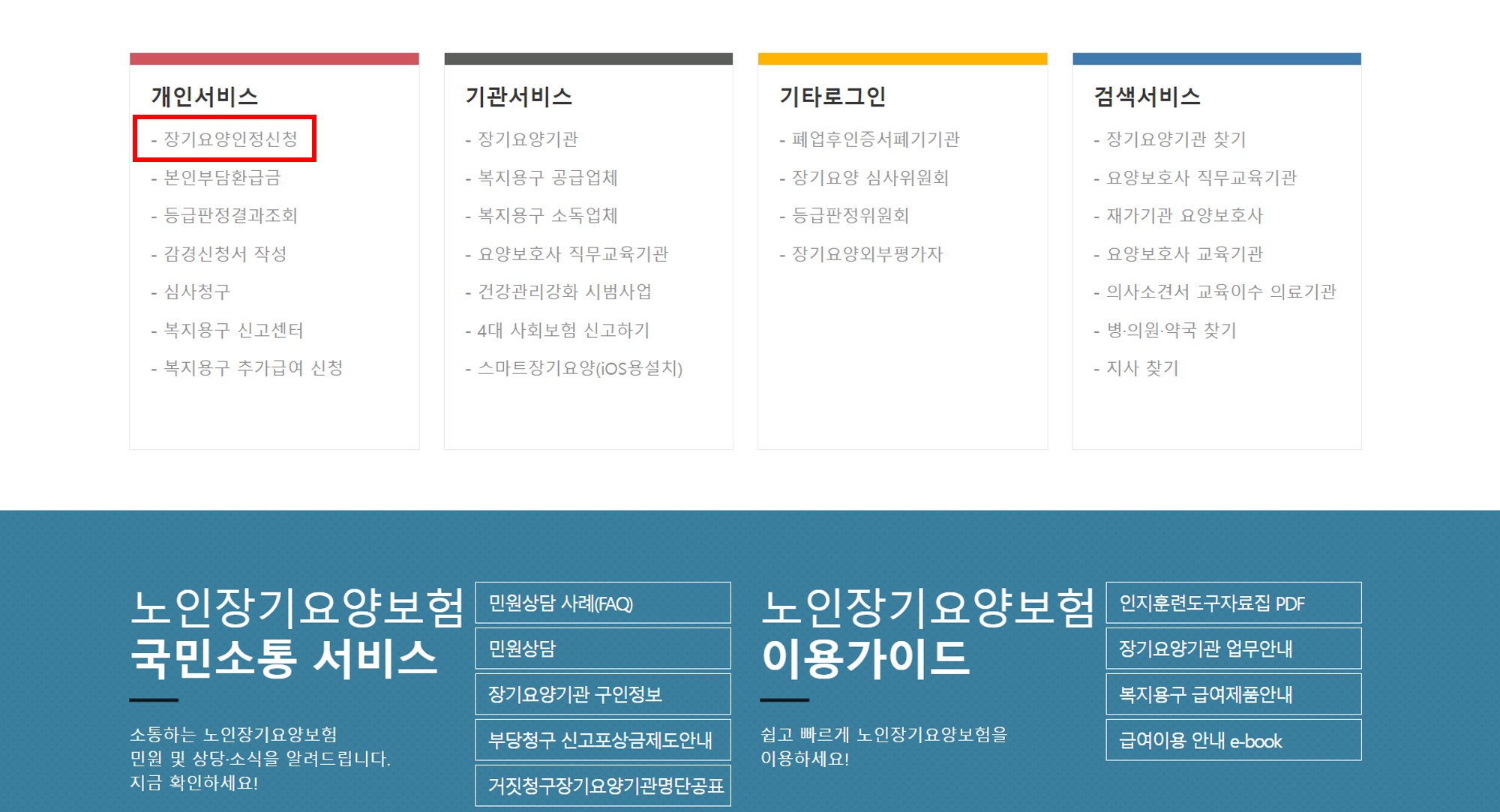해당 홈페이지는 국민건강공단 메인페이지 하단 부분입니다. 개인서비스라고 하는 영역에서 장기요양인정신청을 클릭해 줍니다. 해당 홈페이지로 바로 갈 수 있는 버튼을 클릭하시어 함께 따라오시기 바랍니다.