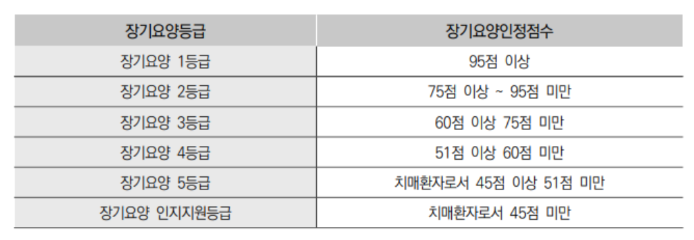 먼저 접수를 진행했다면 2주 안에 국민건강공단 직원이 병원이나 자택으로 방문하여 인정 조사를 진행합니다. 의사의 소견서가 제출되면 등급이 확정되며 이 등급표는 아래와 같습니다.