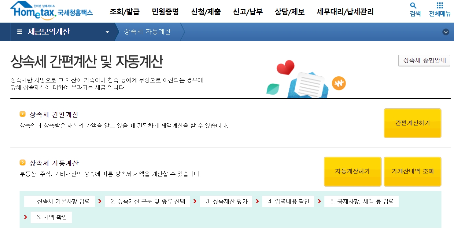 상속세에 대하여 간략하게 계산을 할 수 있습니다. 국세청 홈택스 홈페이지를 활용하시면 되는데요, 홈택스 메인 > 세금 모의 계산 > 상속세 자동 계산에서 간단하게 조회해 볼 수 있습니다.
