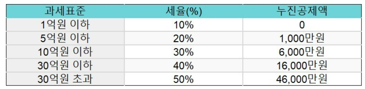상속세율은 아래와 같습니다. 보통 10%에서 50%까지 차등 납부하며 만약 과세표준 금액이 커지게 되면 세율이 그에 따라 올라갑니다. 만약 4억 원의 재산을 상속할 경우 세율은 20%인 8천만 원이며, 누진 공제액은 1천만 원입니다.