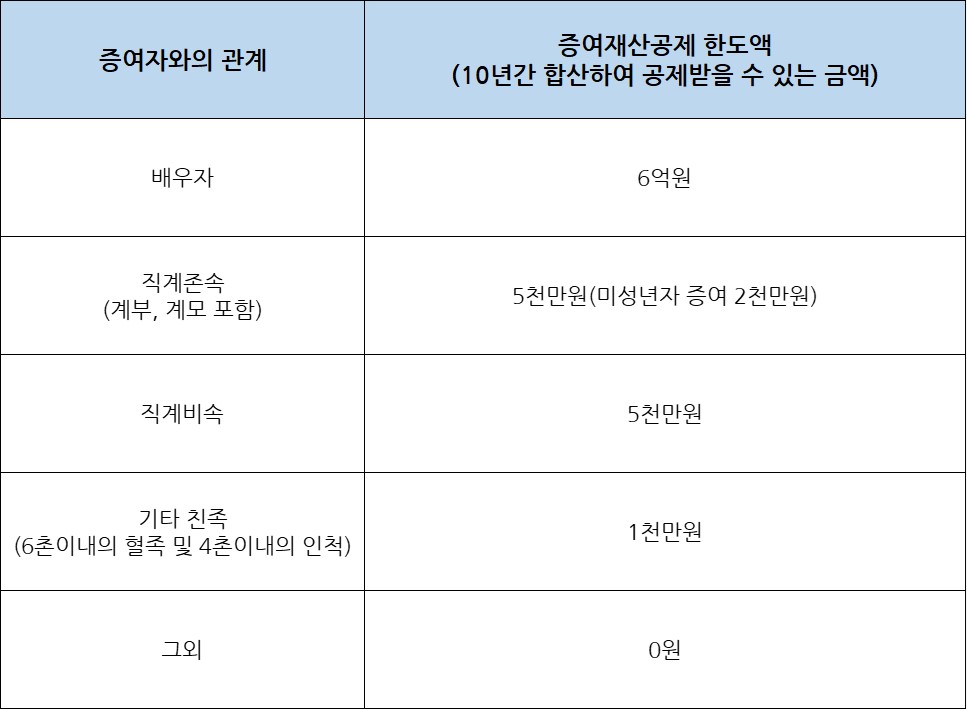 증여세는 증여받은 수증자와의 관계가 매우 중요합니다. 수증자가 배우자, 직계존속, 직계비속, 기초 6촌 이내의 혈족, 4촌 이내의 인척으로부터 증여를 받은 경우 다음 금액이 과세가액에서 공제됩니다.