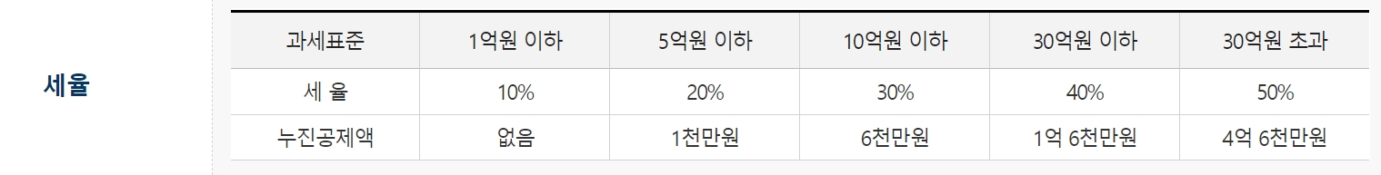 증여세는 과세가액 표준에 따라 5단계로 나뉘어 있습니다. 과세표준이 커지면 증여세율이 최대 50%까지 나올 수 있습니다. 만약 증여 과세표준이 30억 원을 초과할 경우 50%의 경우 누진 공제액이 4억 6천만 원입니다.