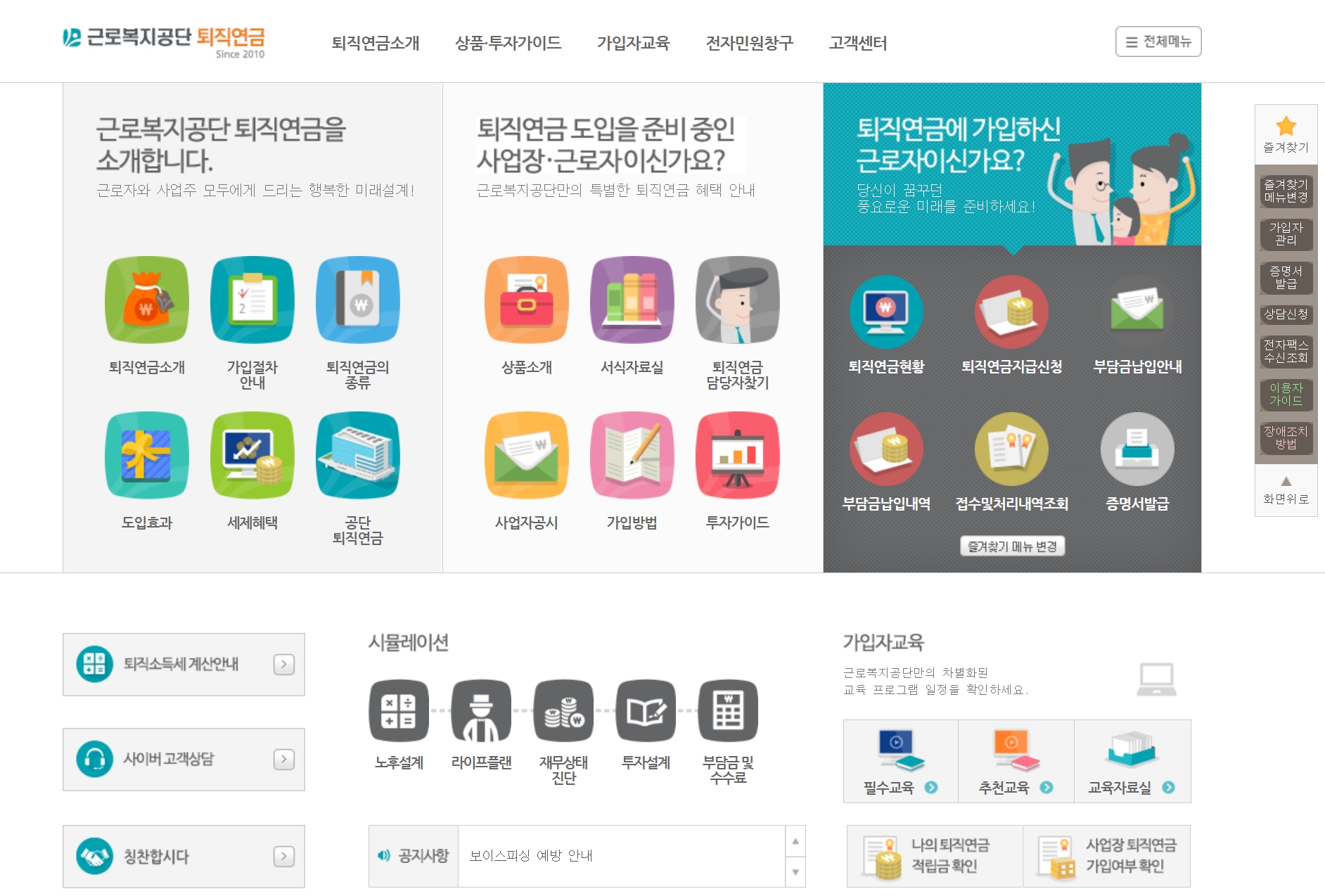 퇴직연금 수령시 은행과 같은 금융사에 방문해도되지만 근로복지공단 홈페이지에서 더 자세한 내용을 교육받을 수도 있고 상품 등을 추천받으실 수 있습니다. 근로복지공단 홈페이지는 아래 연결해놓았습니다.