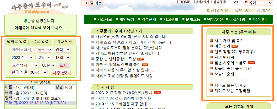 사주풀이를 통해 내가 알고싶은 모든 메뉴를 무료로 확인해볼 수 있는 사주풀이 도우미 사이트도 예시로 보여드립니다. 간편하게 로그인이 없이 진행이 가능하기 때문에 추천드립니다.